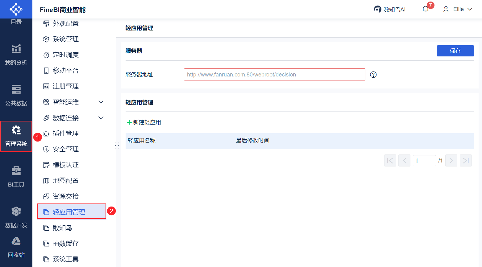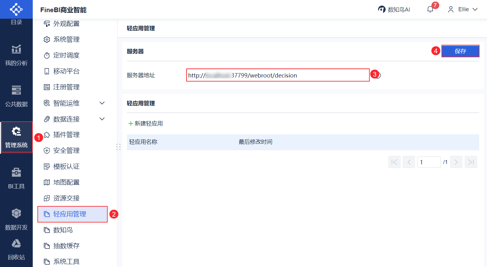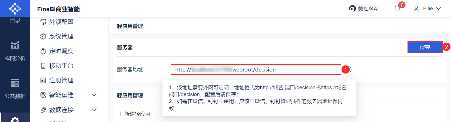 2)进入「管理系统>轻应用管理」,填写服务器地址后「保存」。如下图所示: