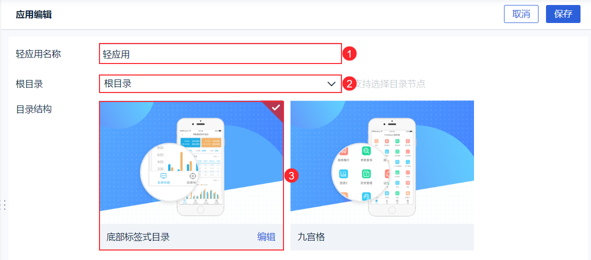 | 3 | 目录结构 | 目录结构,支持设置不同的移动端目录展示形式 注:需要有「移动平台」管理权限,才会显示目录结构内容 | 底部标签式目录 | 可实现在移动端仪表板界面直接点击底部按钮,查看其他仪表板。 点击右下角「编辑」可自定义轻应用的目录样式,如下图所示: