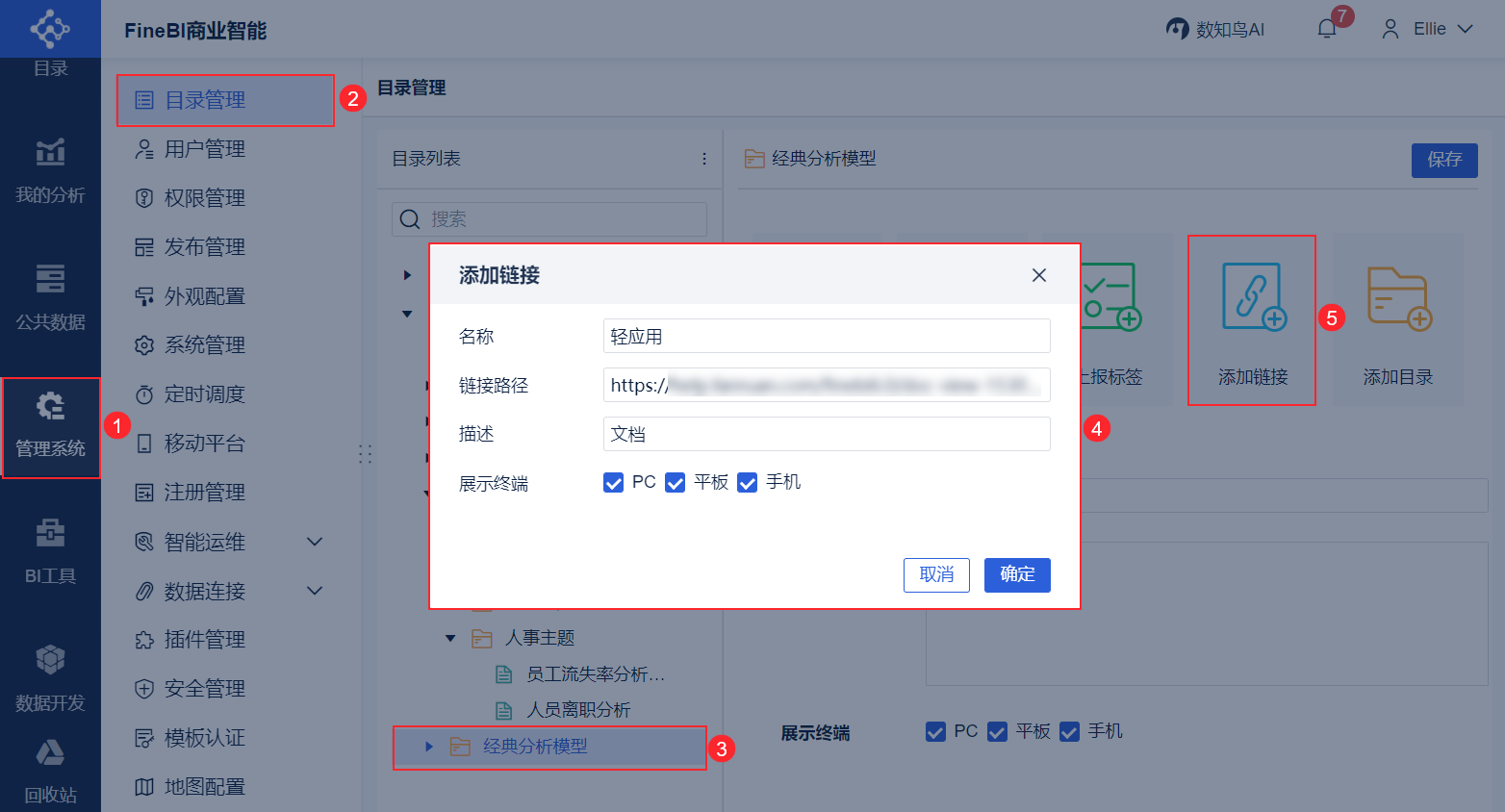 1)在「管理系统>目录管理」中,选择「目录节点」点击「添加链接」,输出信息,即可挂出轻应用。如下图所示: