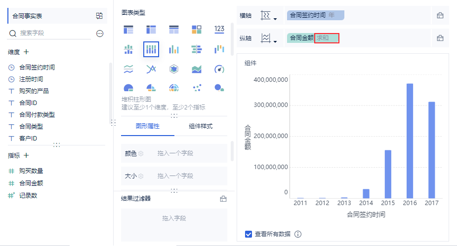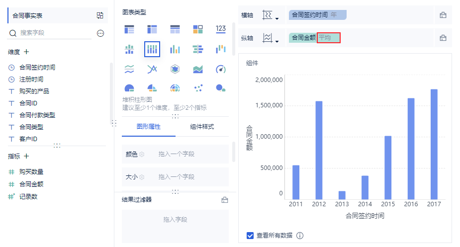 选择「合同金额」的下拉>汇总方式>平均,将汇总方式切换为平均,此时每个柱子表示 2011-2017 对应的每单合同金额的平均金额。如下图所示: