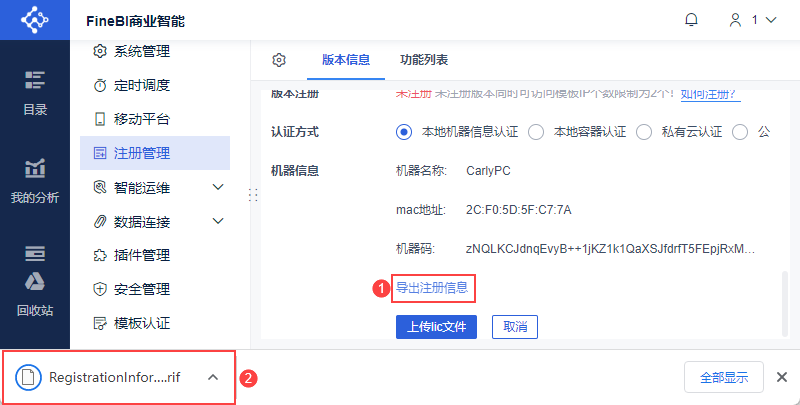 认证方式选择「本地机器信息认证」,点击「导出注册信息」,如下图所示: