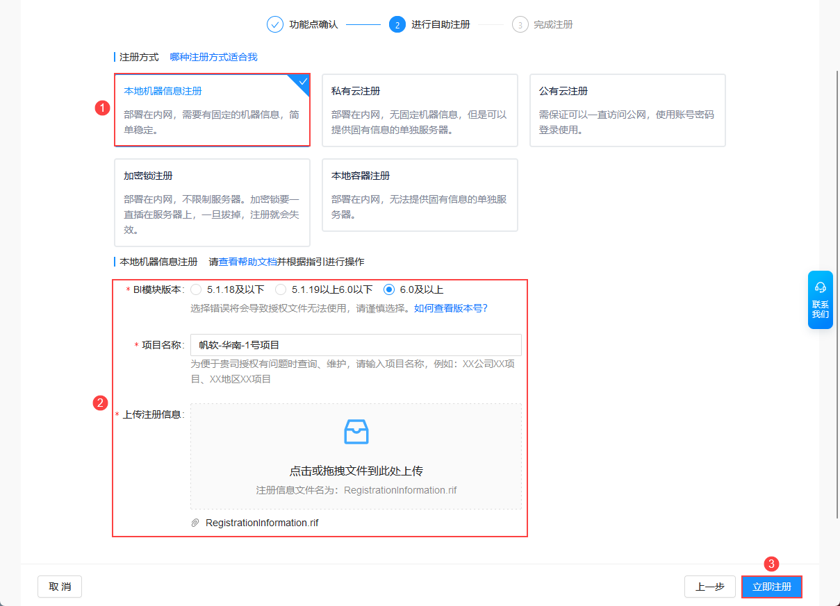 4 进行自助注册 | 1)选择注册方式:本地机器信息注册 2)选择BI模块版本:5.1.18及以下/5.1.19以上6.0以下/6.0及以上 请按照2.1节查看的版本信息选择,选择错误将会导致授权文件无法使用,请谨慎选择。 3)输入项目名称 为便于贵司授权有问题时查询、维护,请输入项目名称,例如:XX公司XX项目、XX地区XX项目 4)上传注册信息:上传2.3节获取的RegistrationInformation.rif文件 |