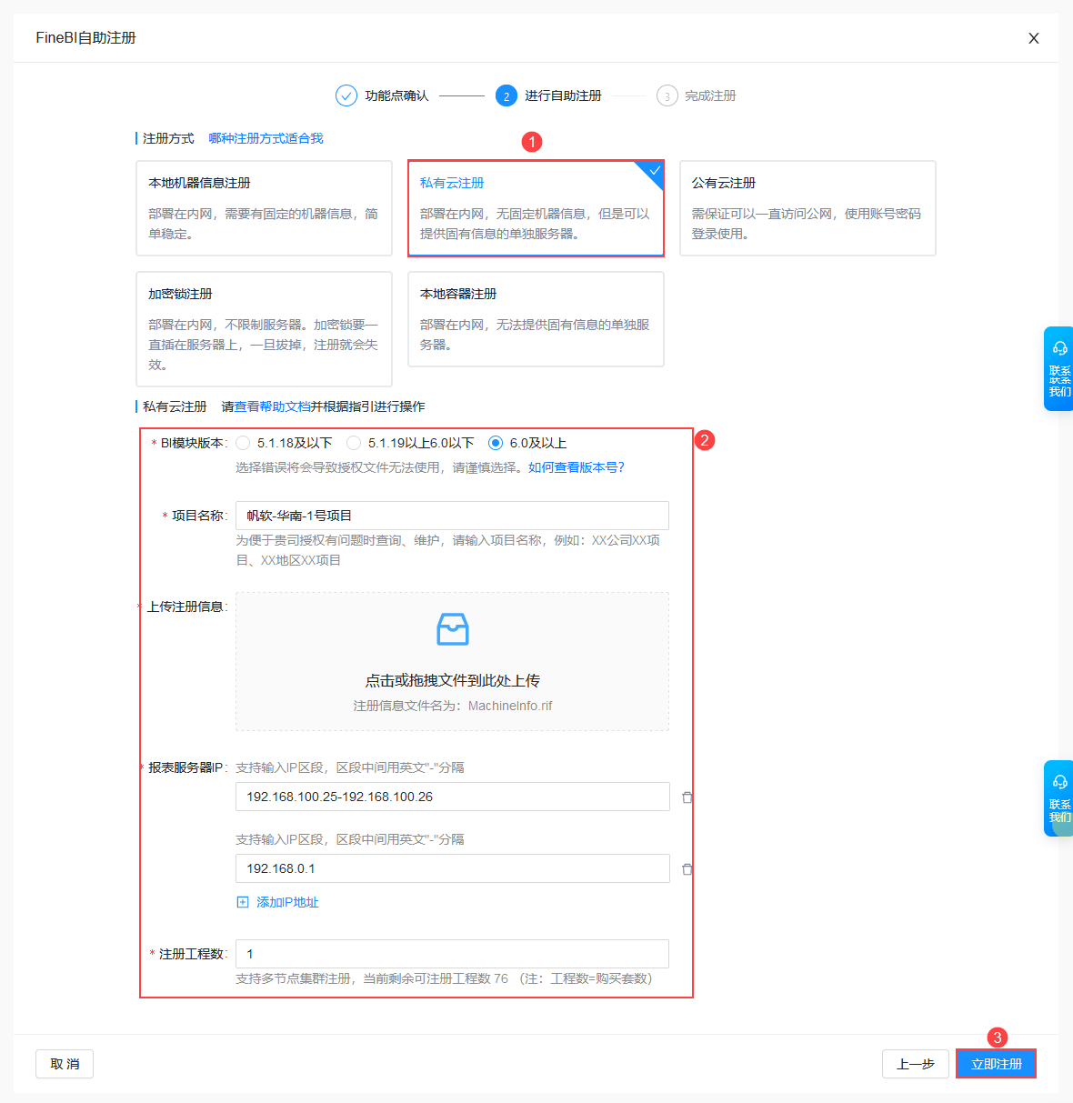 | 4 进行自助注册 | 1)选择注册方式:私有云注册 2)选择BI模块版本:5.1.18及以下/5.1.19以上6.0以下/6.0及以上 请按照2.1节查看的版本信息选择,选择错误将会导致授权文件无法使用,请谨慎选择。 3)输入项目名称 为便于贵司授权有问题时查询、维护,请输入项目名称,例如:XX公司XX项目、XX地区XX项目 4)上传注册信息:上传上一节获取的MachineInfo.rif文件 5)输入报表服务器IP:即允许被注册的报表服务器的内网IP 支持输入 IP 和 IP 区段,区段中间用英文"-"分隔, IP 网段范围为:1.0.0.0-255.255.255.255 例如:192.168.100.25-192.168.100.26、192.168.0.1 6)输入注册工程数:即集群工程节点个数,单机输入1,不可大于剩余可注册工程数
