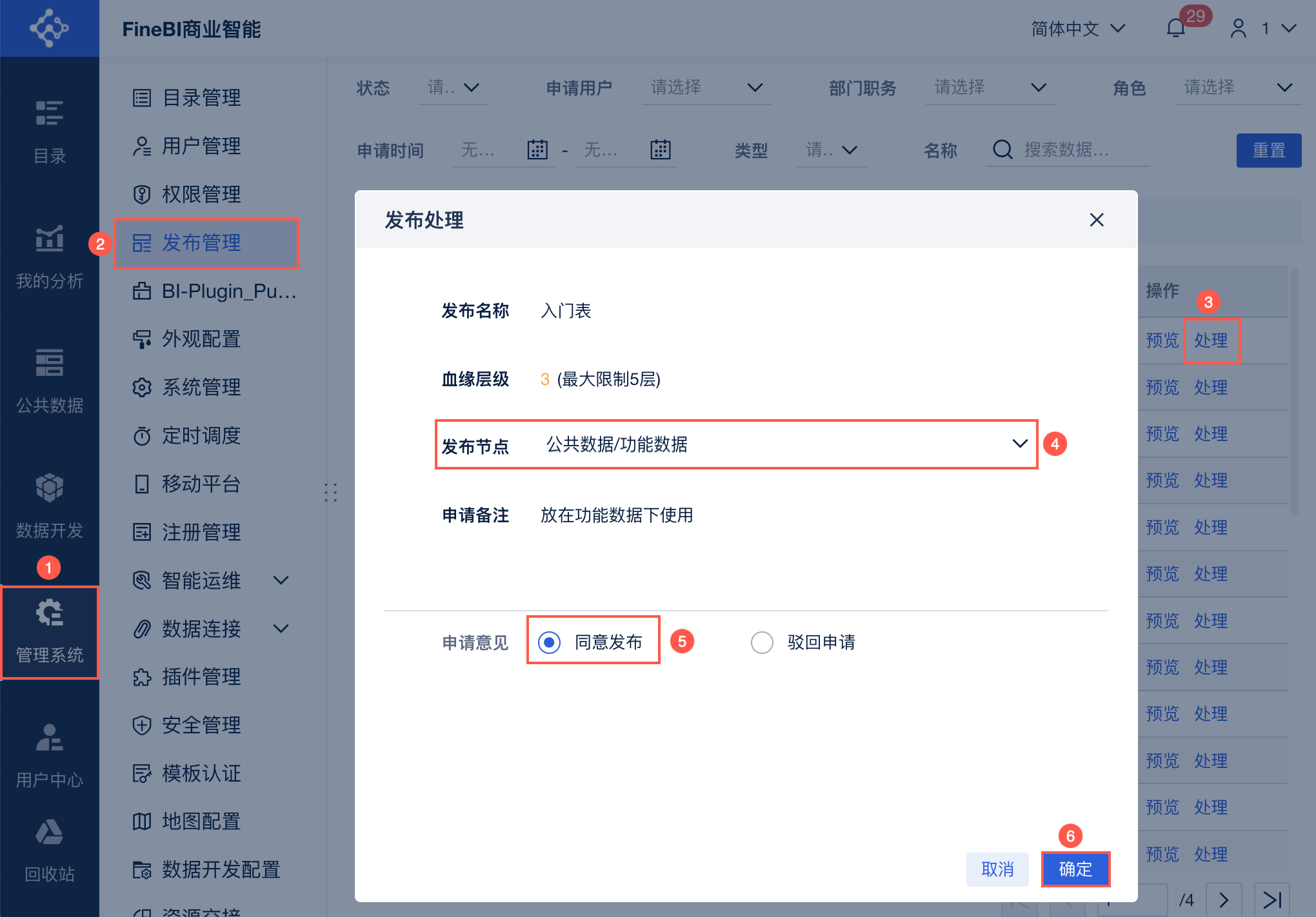 3)点击「处理」,看到申请发布的表信息,选择「发布节点」并选择申请意见。例如,点击「同意发布>确定」。如下图所示: