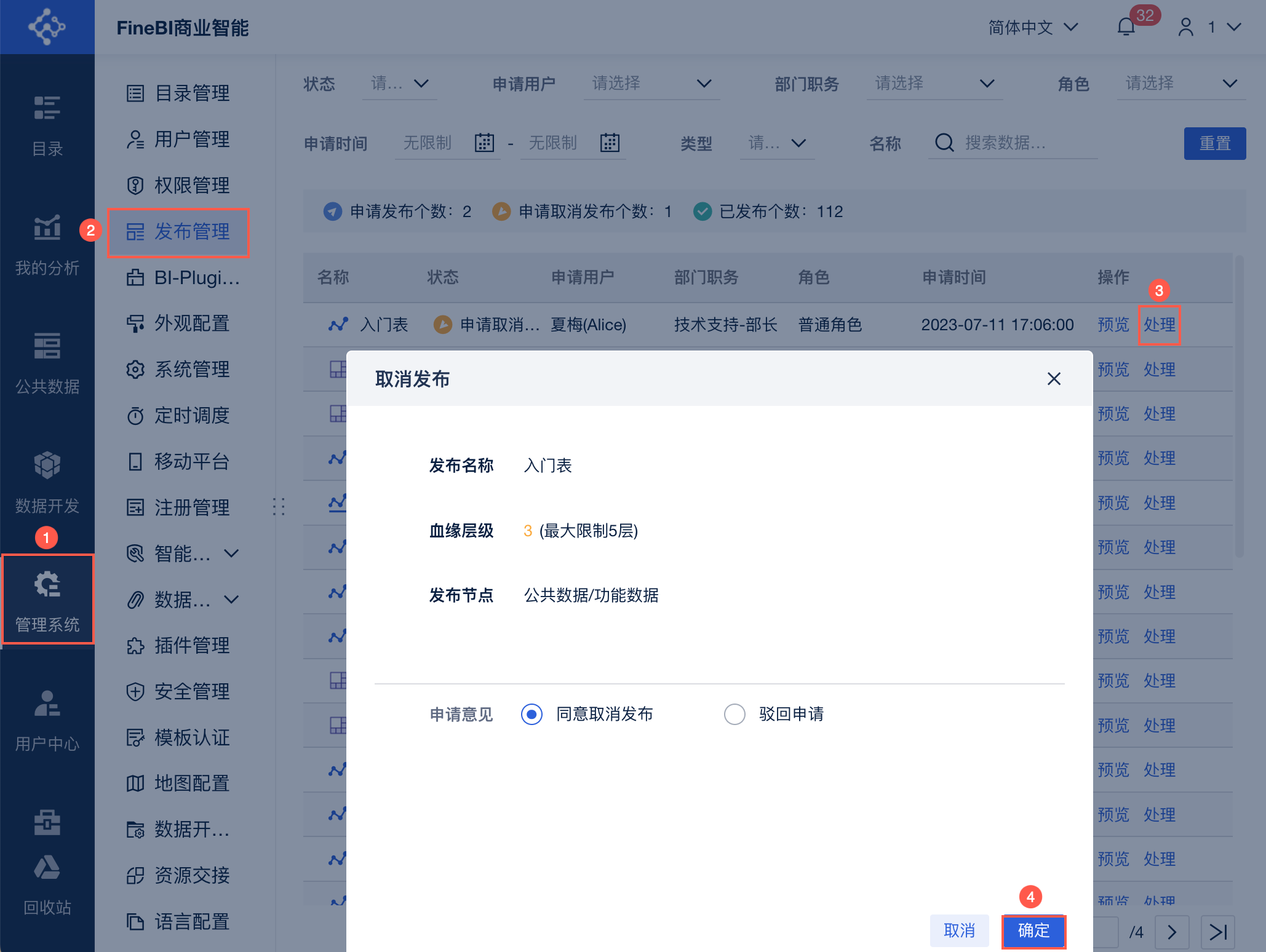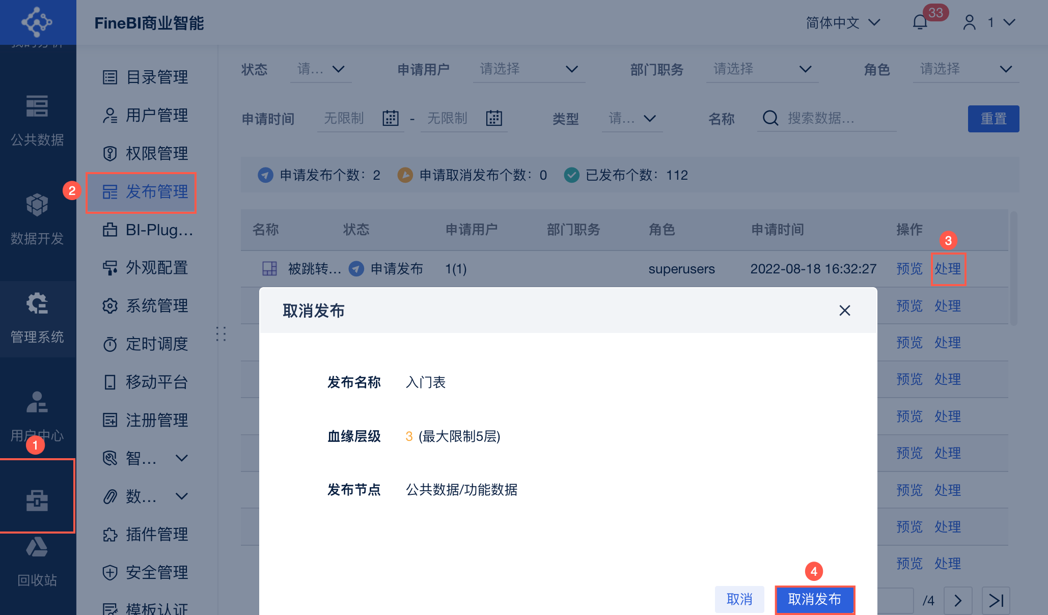 FineBI支持在「我的分析」、「管理系统>发布管理」、「公共数据」三个入口取消发布自助数据集。