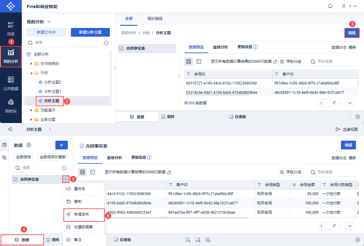 1)用户在「我的分析>分析主题」下,编辑好数据后,可以点击「… >申请发布」,完成发布申请。如下图所示: