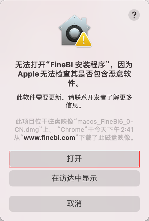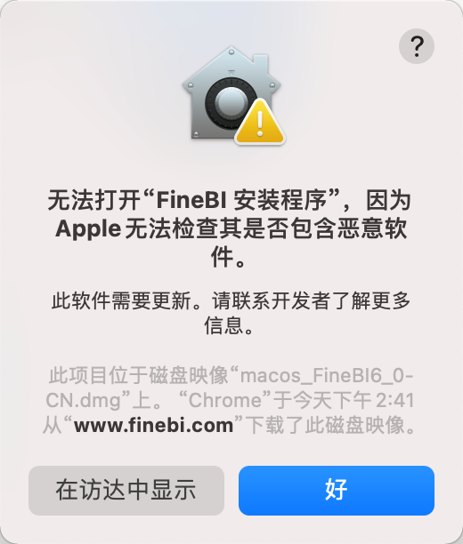 在官网下载 Mac安装时,有时候会遇到的安全提示「无法打开“FineBI 安装程序”,因为Apple无法检查其是否包含恶意软件」。如下图所示: