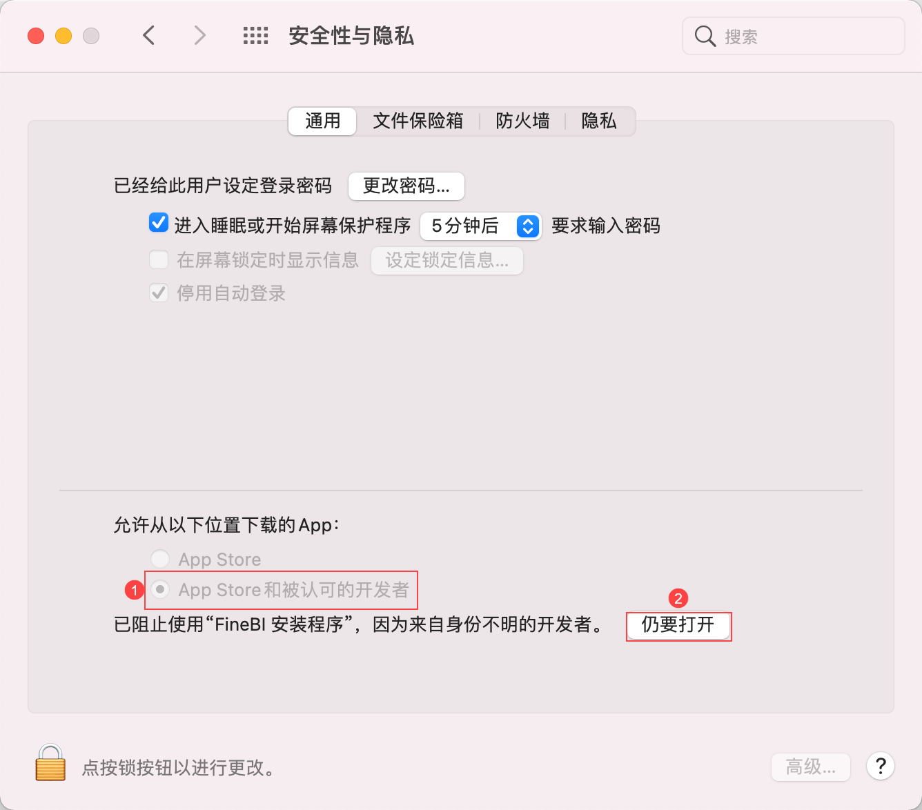 在「安全性与隐私设置」中,允许从以下位置下载 APP ,选择「App Store和被认可的开发者」。