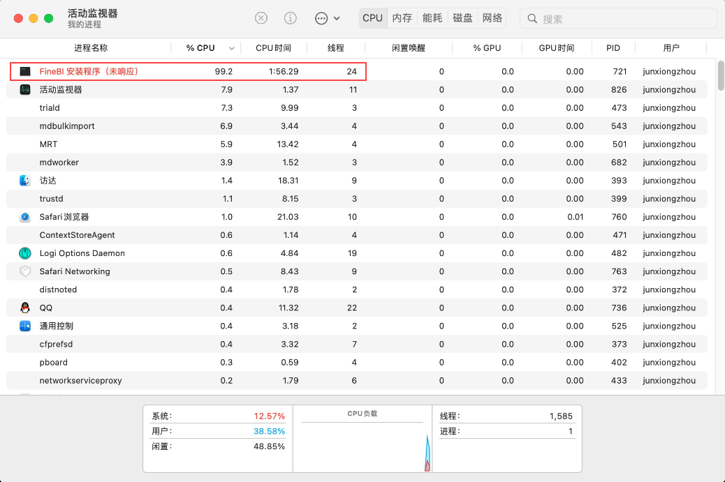 Mac部署FineBI时,卡在许可协议步骤,且伴随服务器负载过高的现象。