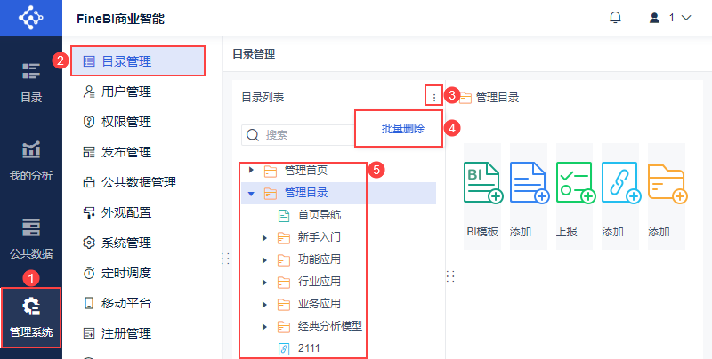 超管登录FineBI系统,点击「管理系统>目录管理」,在目录列表中选择「批量删除」,将所有挂出在目录的仪表板全部删除,如下图所示: