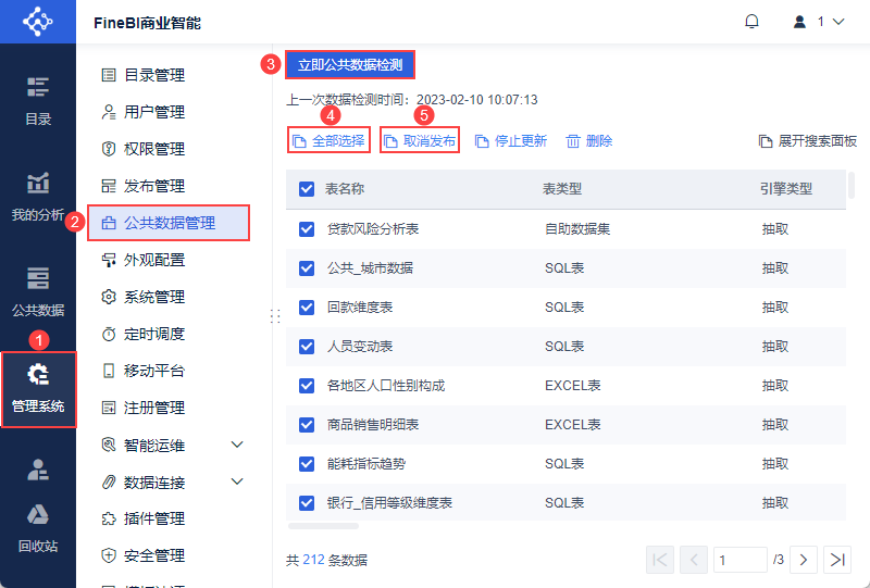 超管登录FineBI系统,点击「管理系统>公共数据管理」,点击「立即公共数据检测」,点击「全部选择>取消发布」。如下图所示: