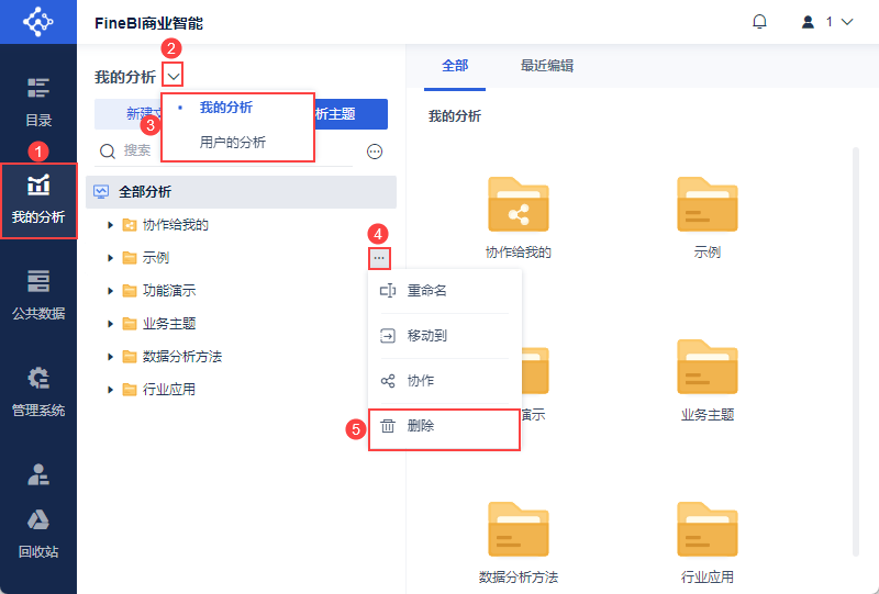 超管登录FineBI系统,点击「我的分析」/「用户的分析」,选中文件夹并删除,如下图所示: