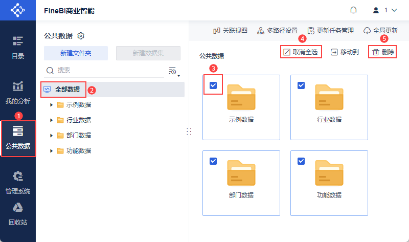 超管登录FineBI系统,点击「公共数据>全部数据」,勾选任意文件夹,点击「全选>删除」 ,删除内置的公共数据,如下所示: