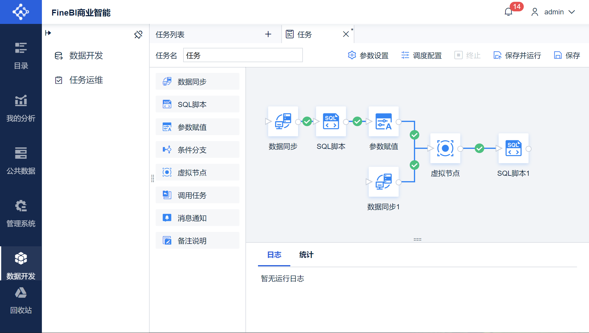 FineBI v6.0 集成 FineDataLink 数据开发模块,具备ELT、ETL双核数据开发引擎,灵活满足不同数据处理场景,IT人员可使用该功能将处理好的高质量数据同步至 FineBI,以供业务人员自助分析。