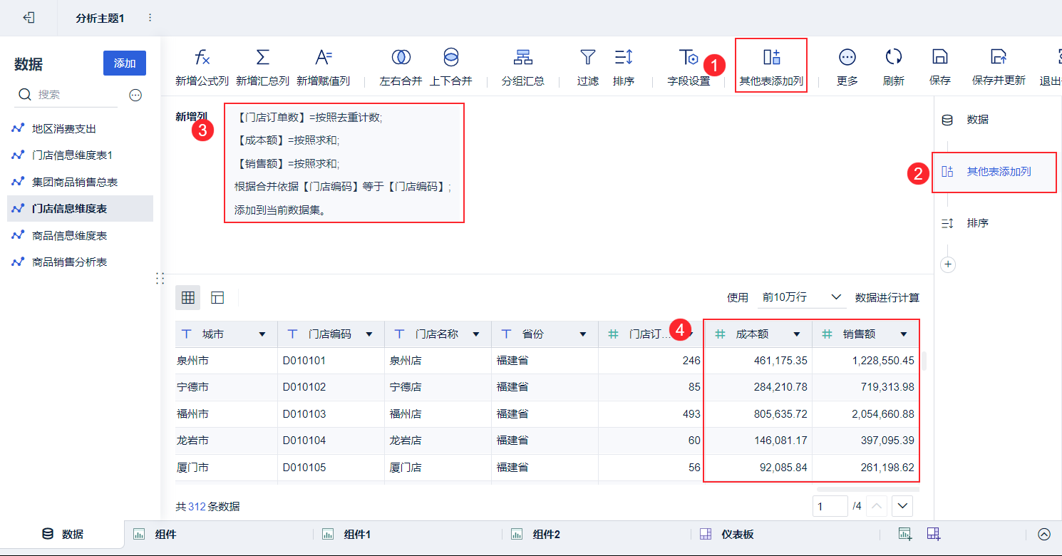 对数据表添加计算字段、钻取、明细过滤等待分析区域的分析,会同步到模型上,在主题中再次使用该表分析可直接拉取字段,无需再复制组件。