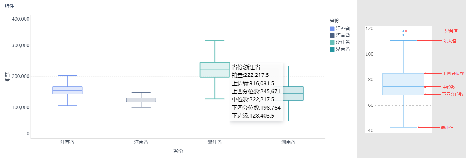 通过箱形图可以比较直观观察数据是否有偏向性、是否对称、数据是否有异常值、数据分布等。