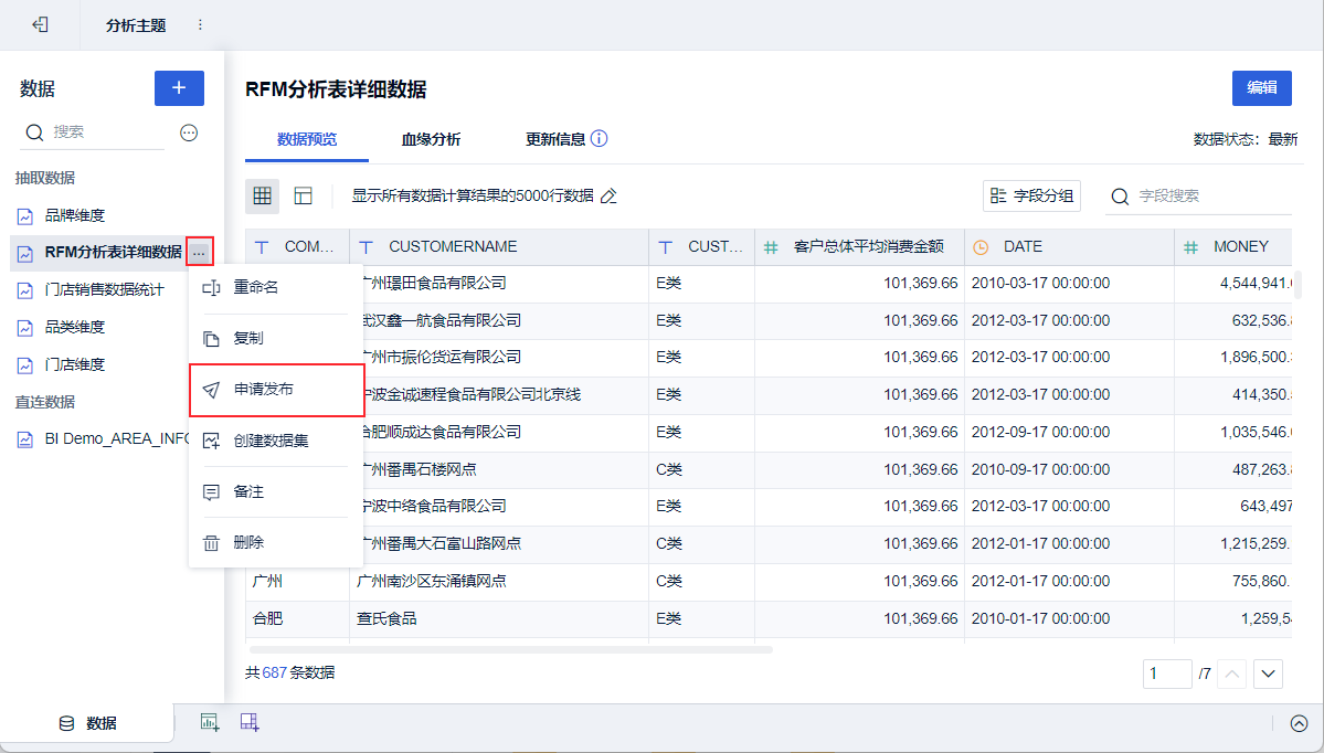 在分析主题中,用户可以将自己分析好的数据表申请发布到公共数据中,方便其他用户查看或使用。
