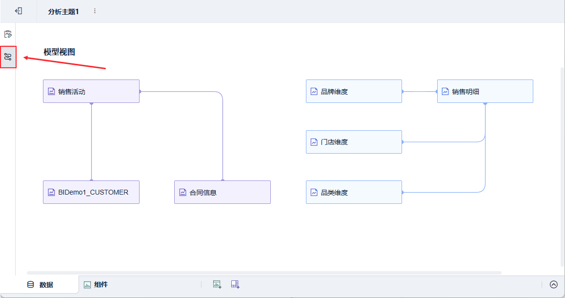 在分析主题的「数据tab」下,点击如下图的图标即可进入主题模型的设置界面。通过拖拽的方式可以设置表与表之间的模型关系。