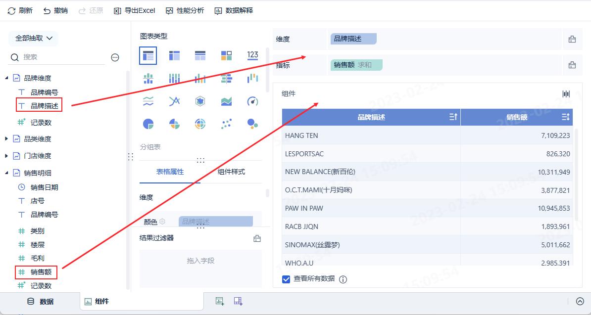 建立模型的多表在组件分析中会合并到待分析区域,支持跨表分析。如下图所示: