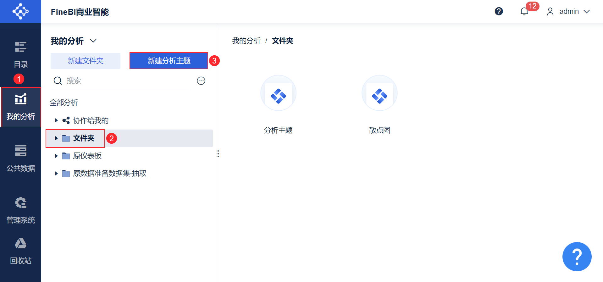 1)管理员进入系统,点击「我的分析」,选中某个文件夹,点击「新建分析主题」。如下图所示: