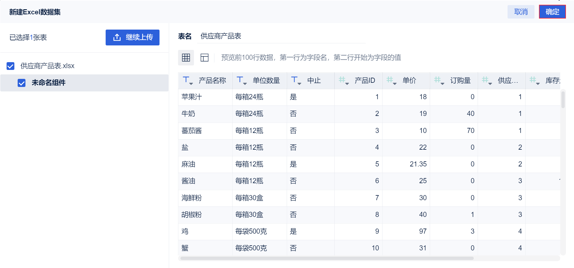 2)点击「本地Excel文件>上传数据」,上传表数据。如下图所示: