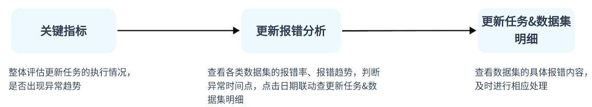 • 保证数据集的正常使用:更新任务是否正常执行,若出现异常状况,是否能够感知并了解异常原因,及时进行相应处理。