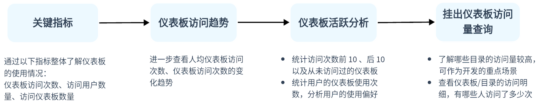 把握核心指标,包括:仪表板访问次数、访问用户数量、访问仪表板数量,整体了解仪表板的使用情况。