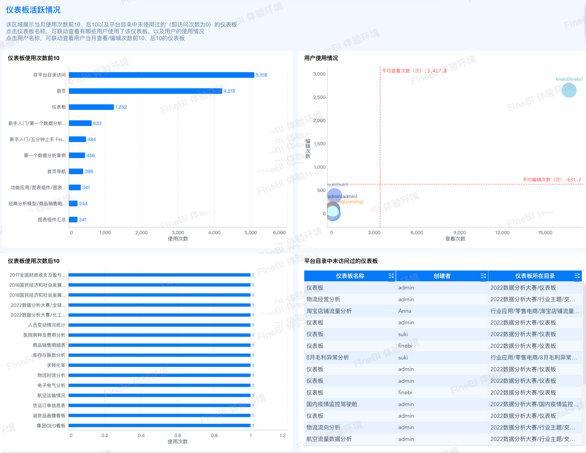 后 10 以及目录中从未访问过的仪表板,可对其进行优化或下架处理。
