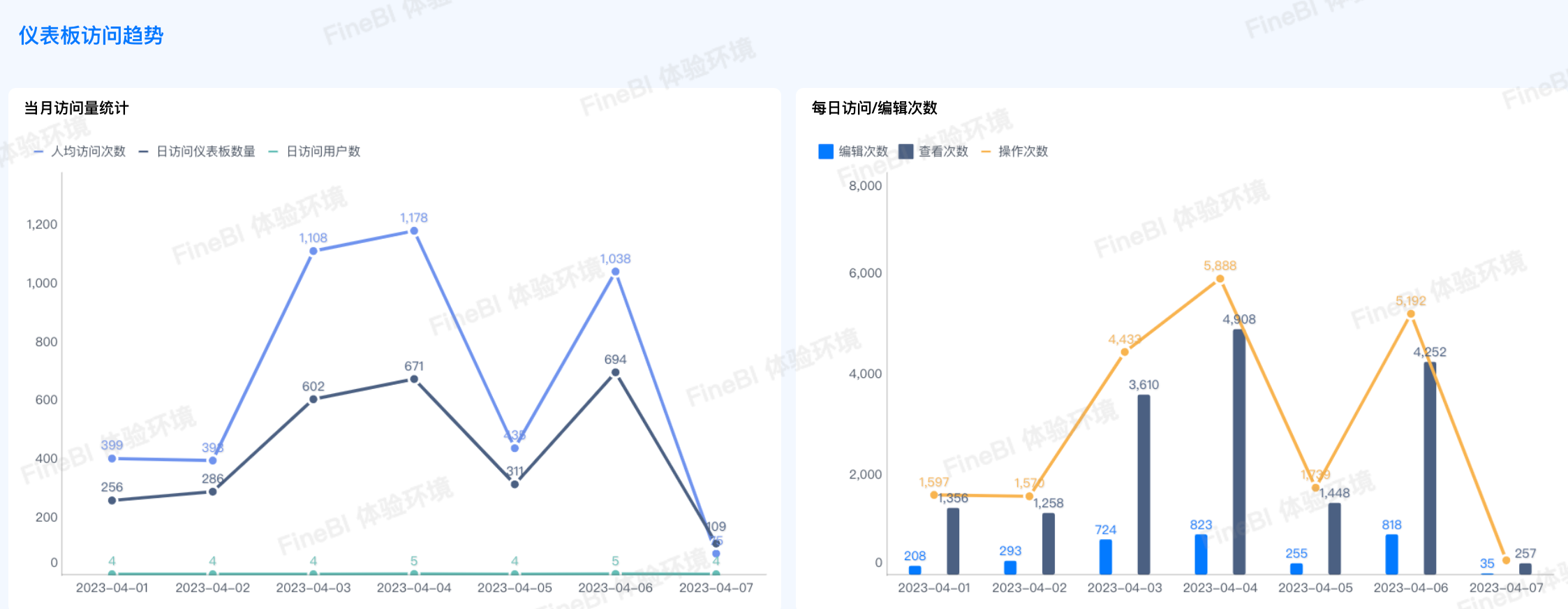 以折线图的方式展示每日的访问用户数量、访问仪表板数量以及人均仪表板访问次数,便于用户直观地了解关键指标的变化趋势。