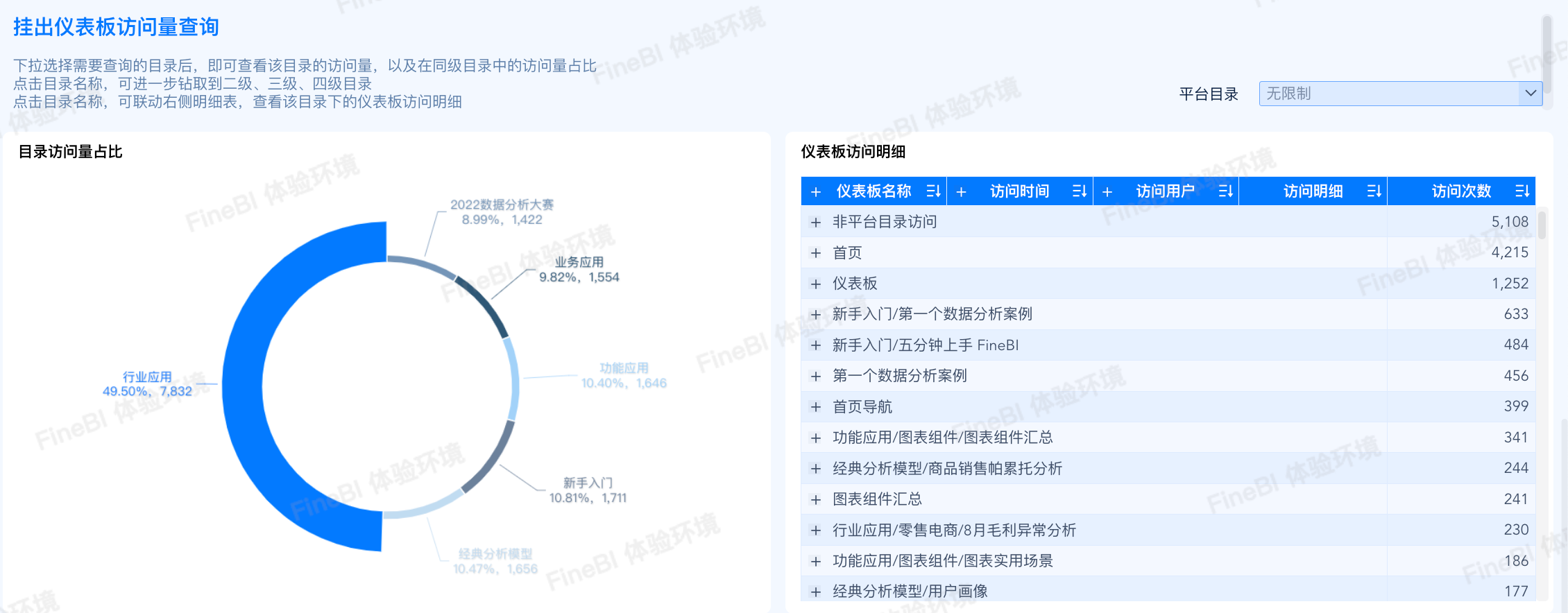 目录中的仪表板通常按照业务场景放置,通过目录访问占比以及明细数据,了解到不同部门/用户的对业务场景的需求与偏好,并可以针对性地开发仪表板。