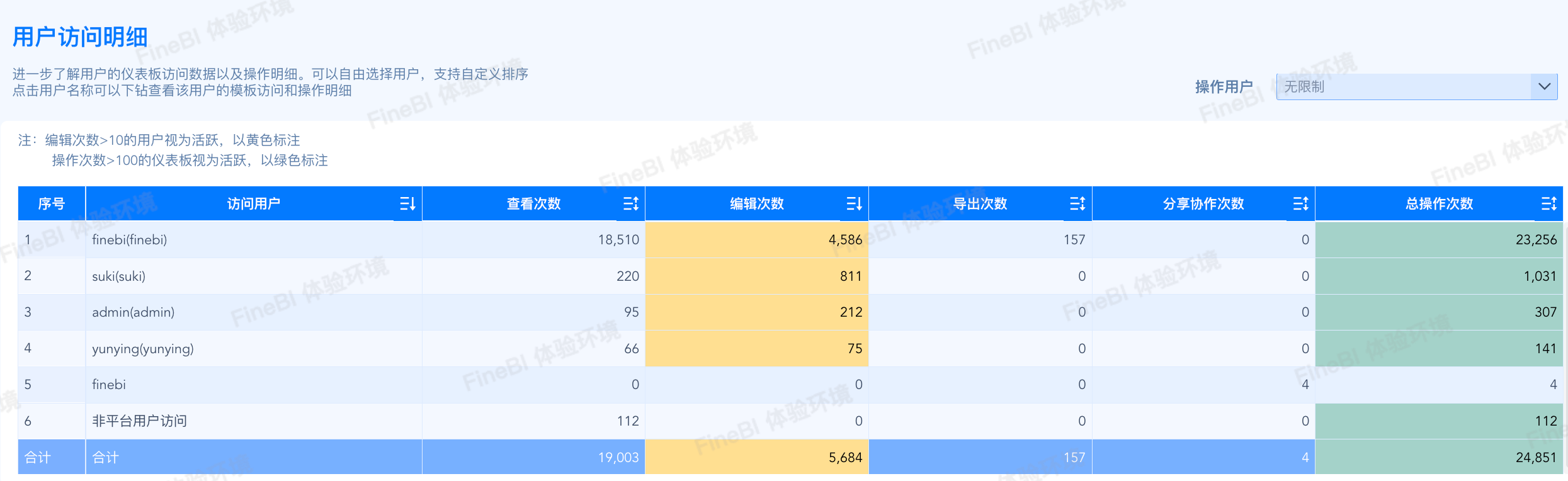 通过点击用户名称可以下钻查看该用户的仪表板访问和操作明细。