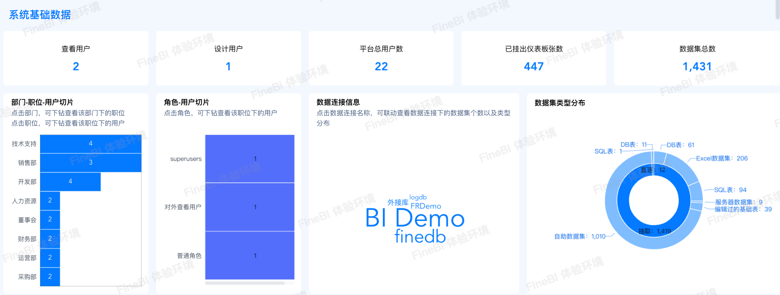 快速了解系统的公共数据情况,包括:已挂出仪表板张数、数据连接、数据集。