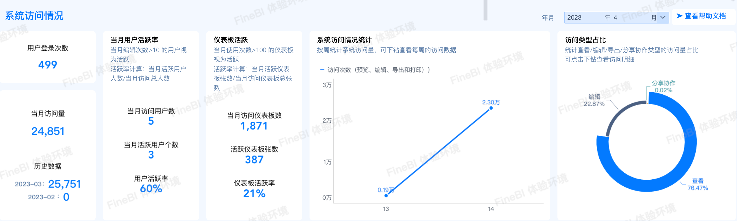 整体展示用户登录次数、当月访问次数、用户活跃率、仪表板活跃率等关键指标。