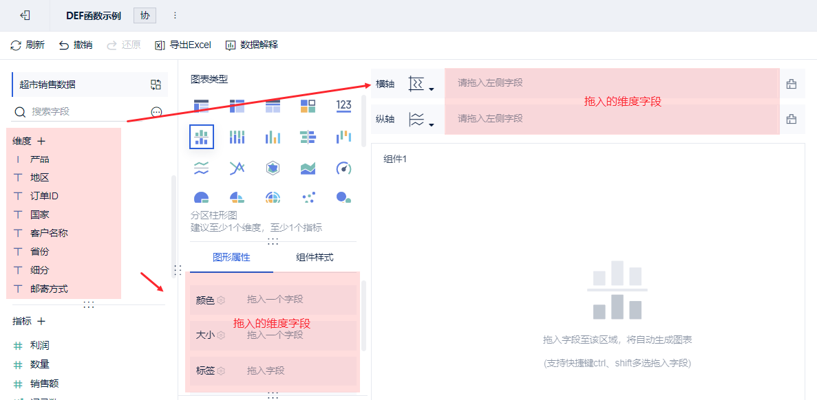 图表:所有拖入分析栏以及图表属性的「维度」字段。