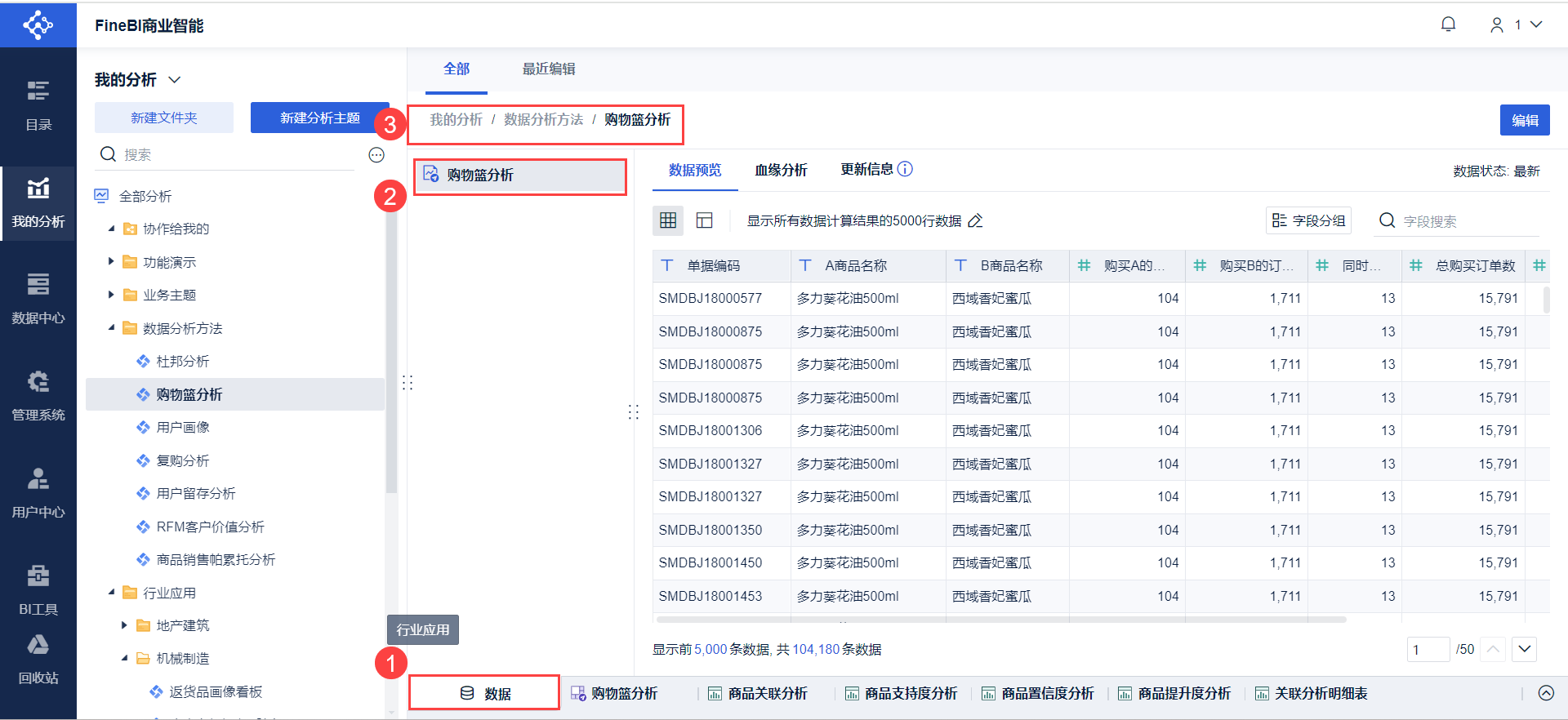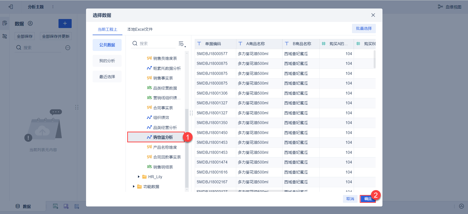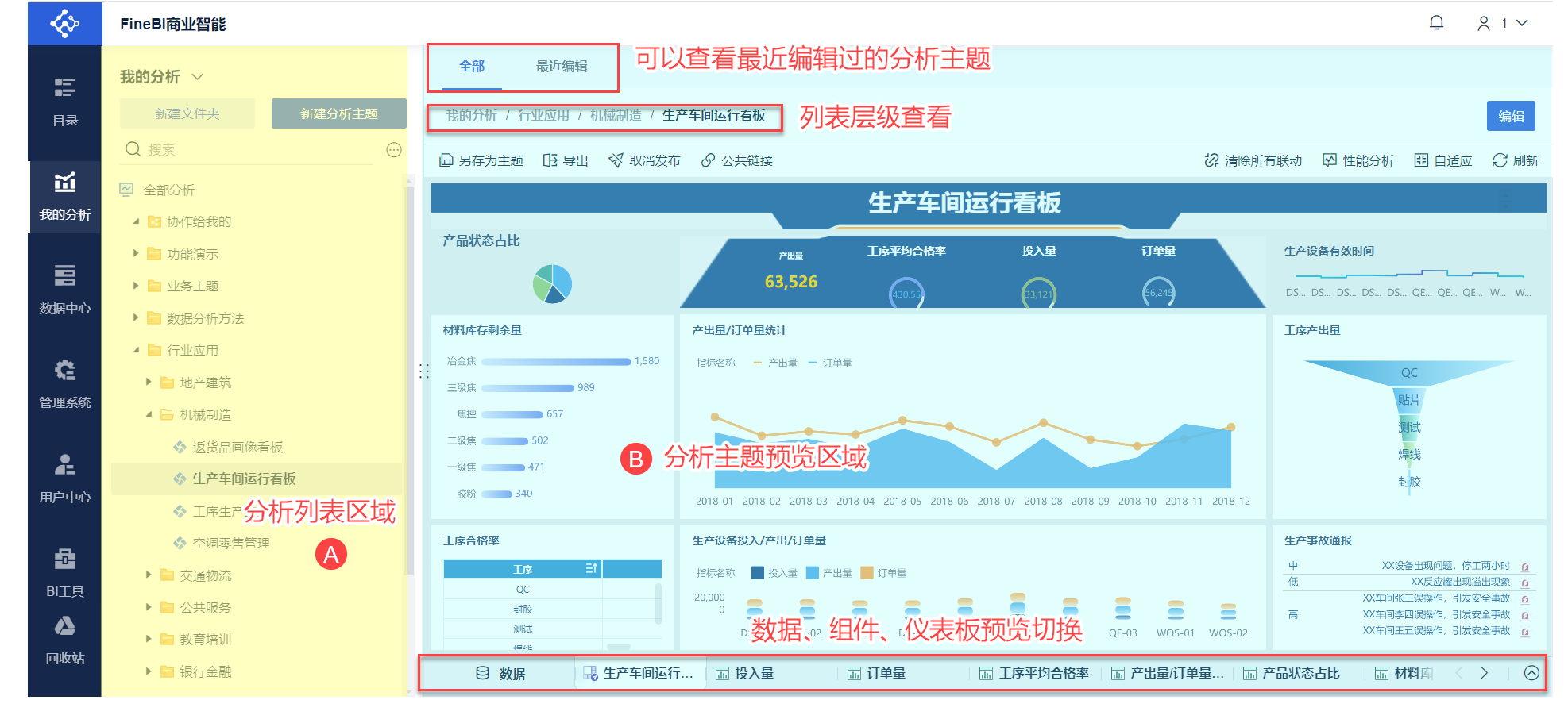 在分析列表选中某个分析主题后,可以查看分析主题中的相关可编辑数据、组件和仪表板的内容。