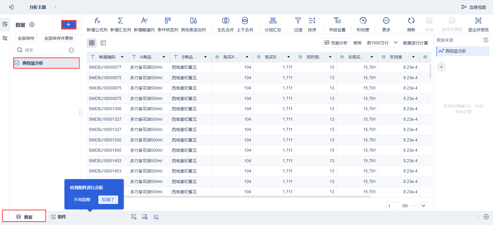 编辑数据:在「数据界面」使用上方工具栏中的选项可对数据表进行分析。如下图所示: