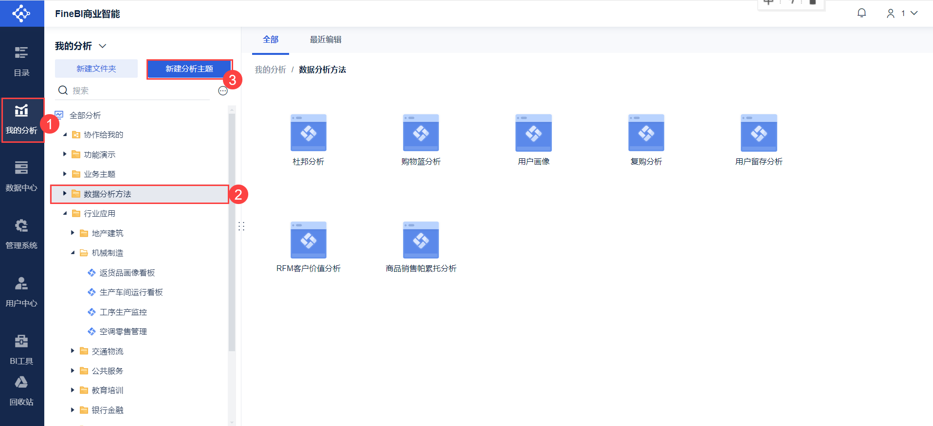1)管理员进入系统,点击「我的分析」,选中某个文件夹,点击「新建分析主题」。如下图所示: