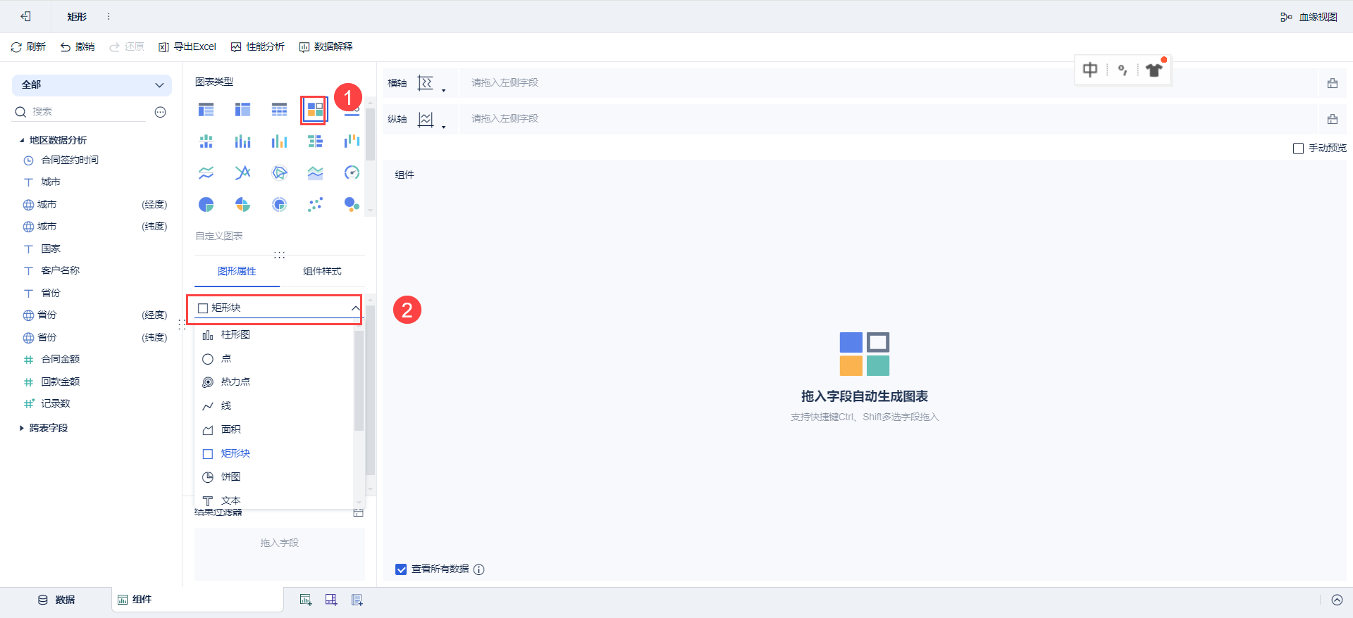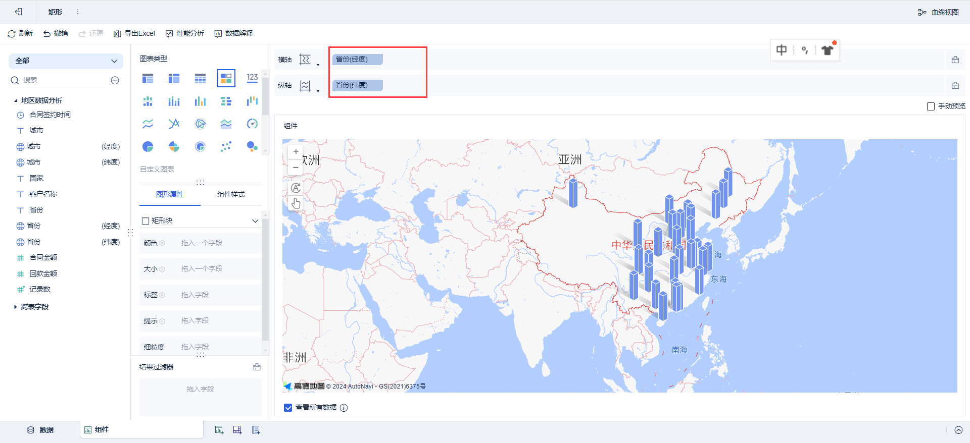 4)匹配好数据后维度字段生成「省份(经度)」和「省份(维度)」,图表类型选择「自定义图表」,图形属性选择「矩形块」,如下图所示: