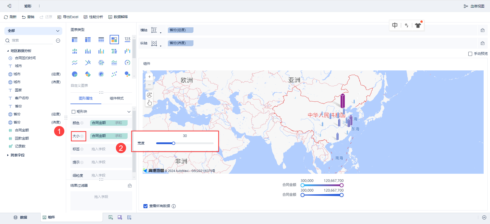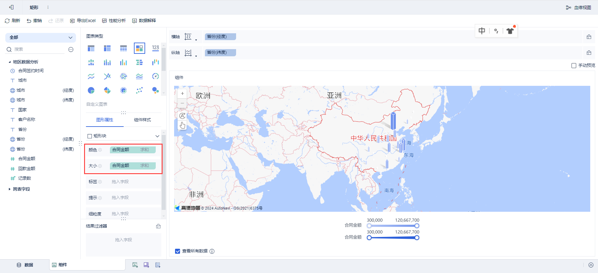3)设置「合同金额」矩形块大小,矩形块越大,代表的金额越高,如下图所示: