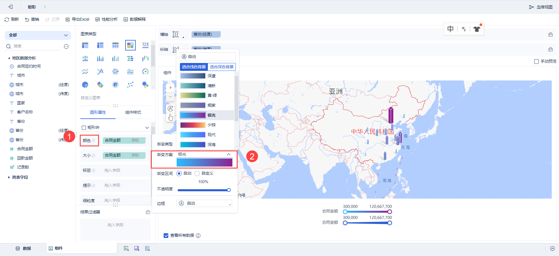2)设置「合同金额」矩形块的颜色,渐变方案选择「极光」,颜色越深,金额越高,如下图所示: