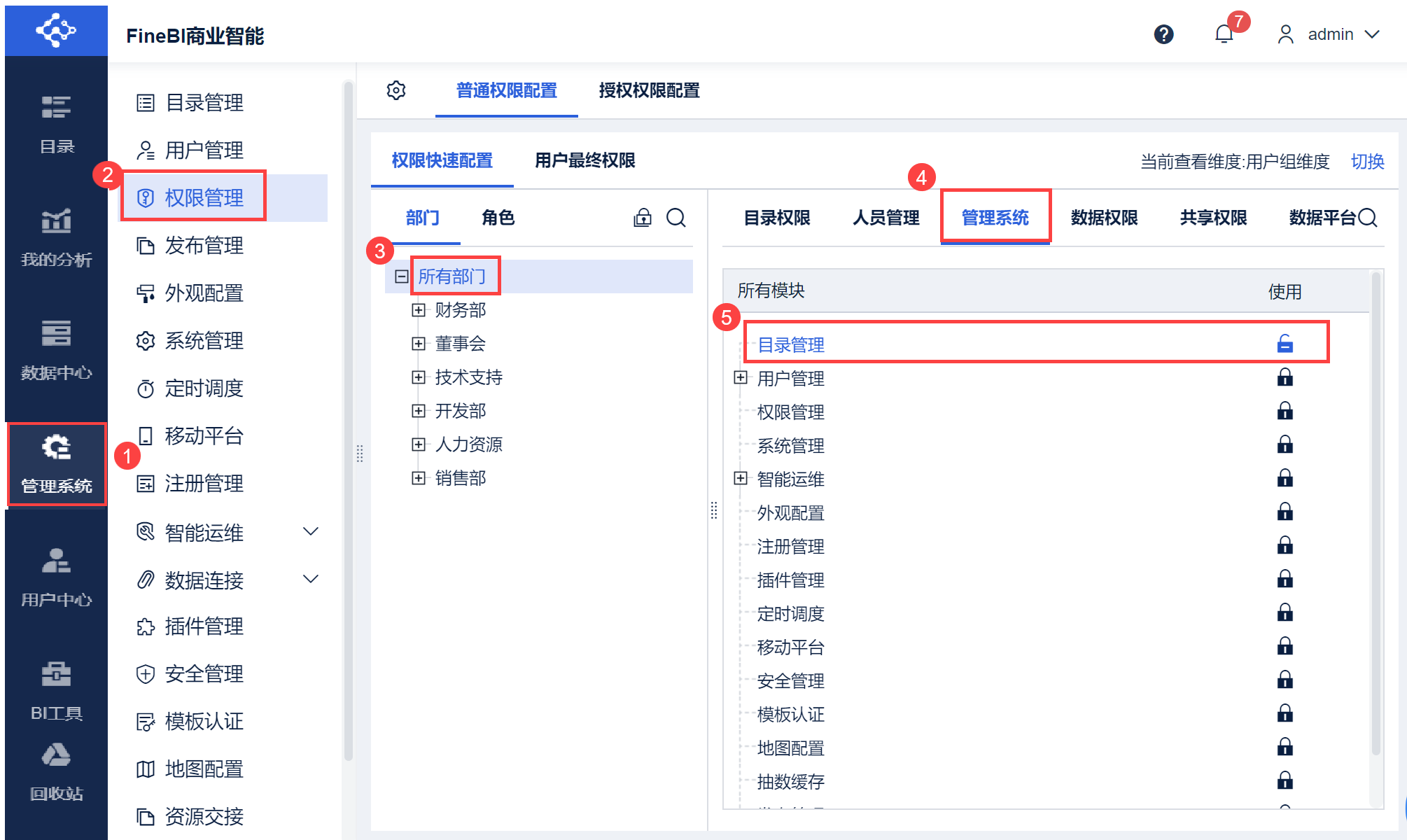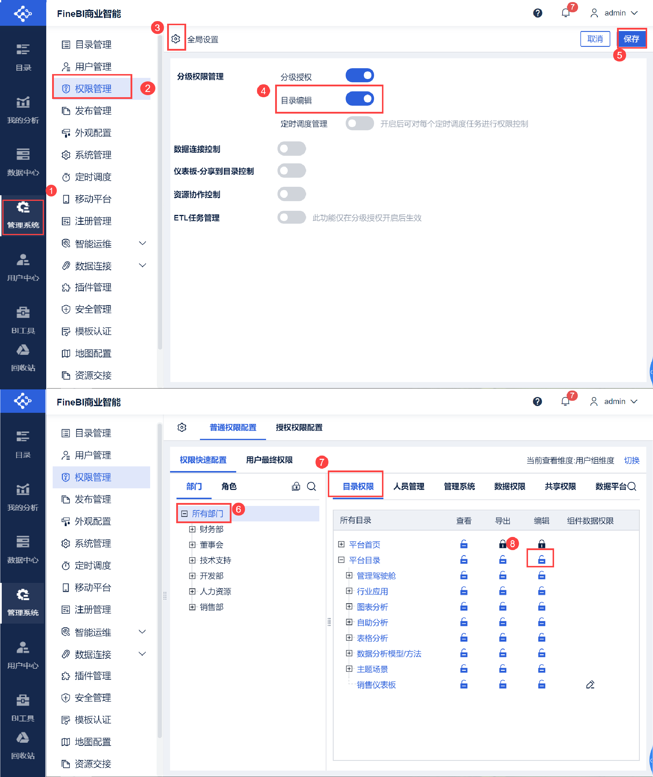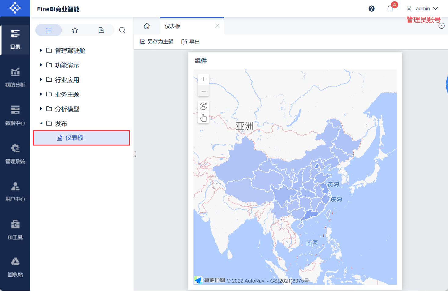 管理员在发布该仪表板以后,普通用户想要查看,需要管理员分配发布仪表板所在目录权限和仪表板内数据权限