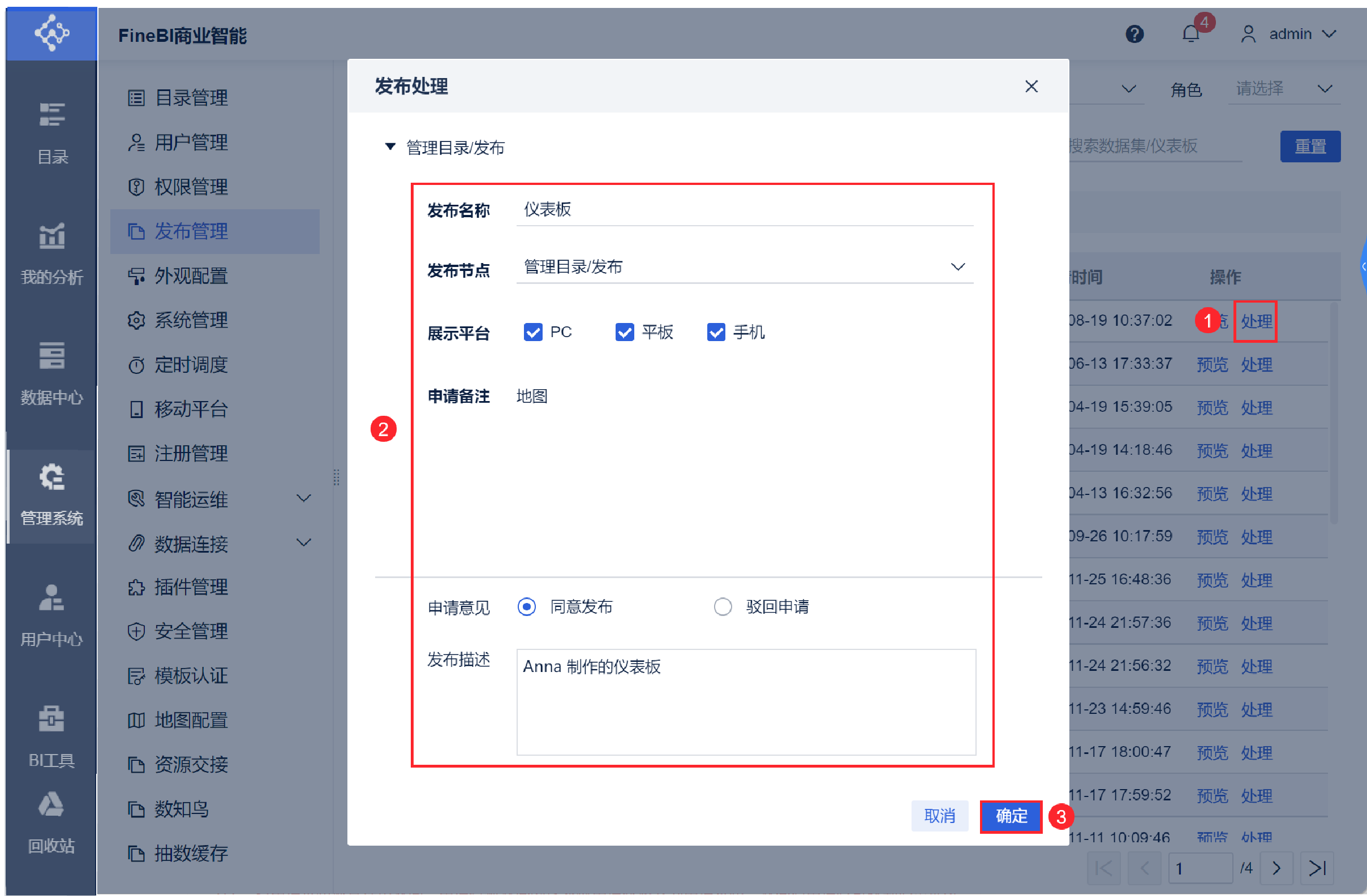 3)管理员点击「处理」,可对该申请发布的仪表板进行发布处理,修改发布名称、发布节点、展示平台、进行申请备注、选择申请意见并增加发布描述,如下图所示: