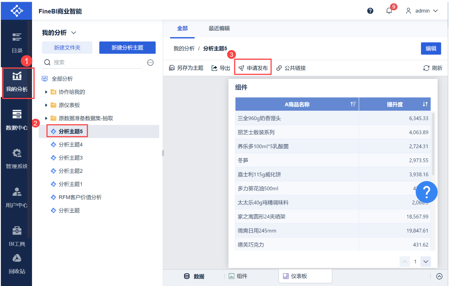 用户制作好的仪表板(比如某年度的大屏目标)希望能让 FineBI 中其他用户在其拥有权限的目录中看到,此时就可以使用申请发布功能。
