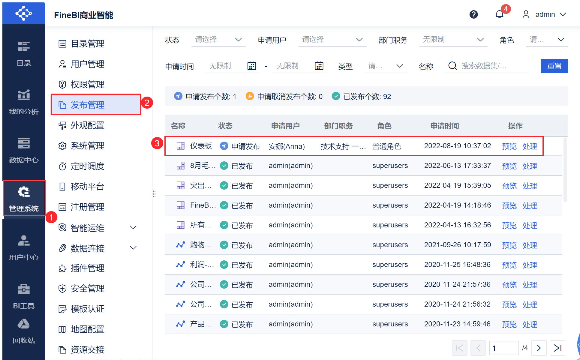 管理员进入「管理系统>发布管理」,可以查看到当前申请发布的仪表板以及仪表板个数,如下图所示: