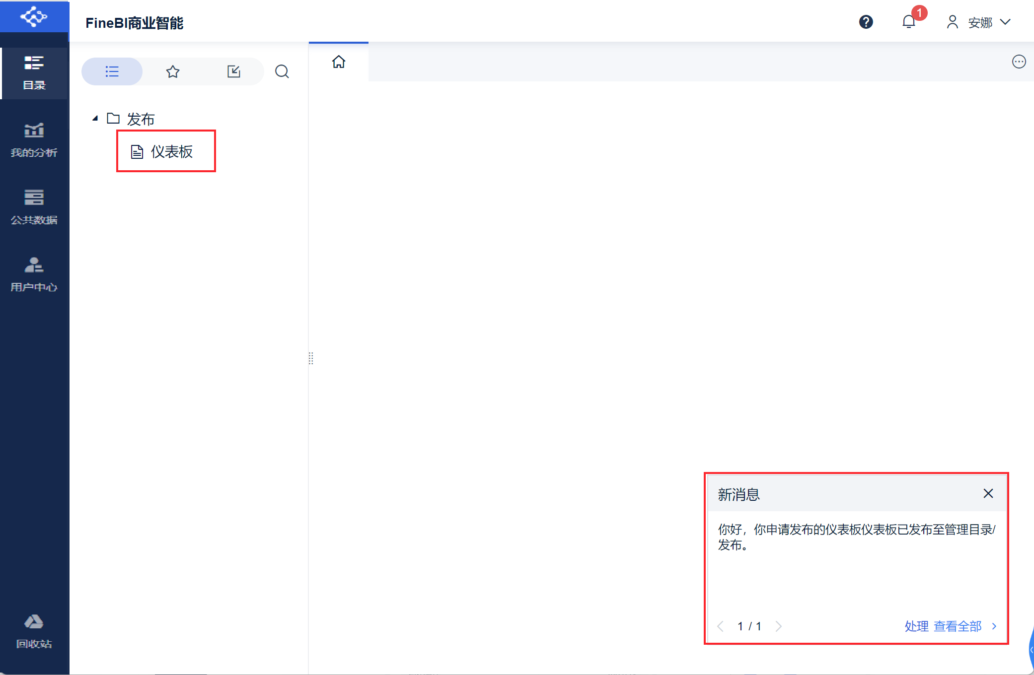 Anna 登录后可以看到自己消息提醒,申请发布的仪表板已发布,如下图所示: