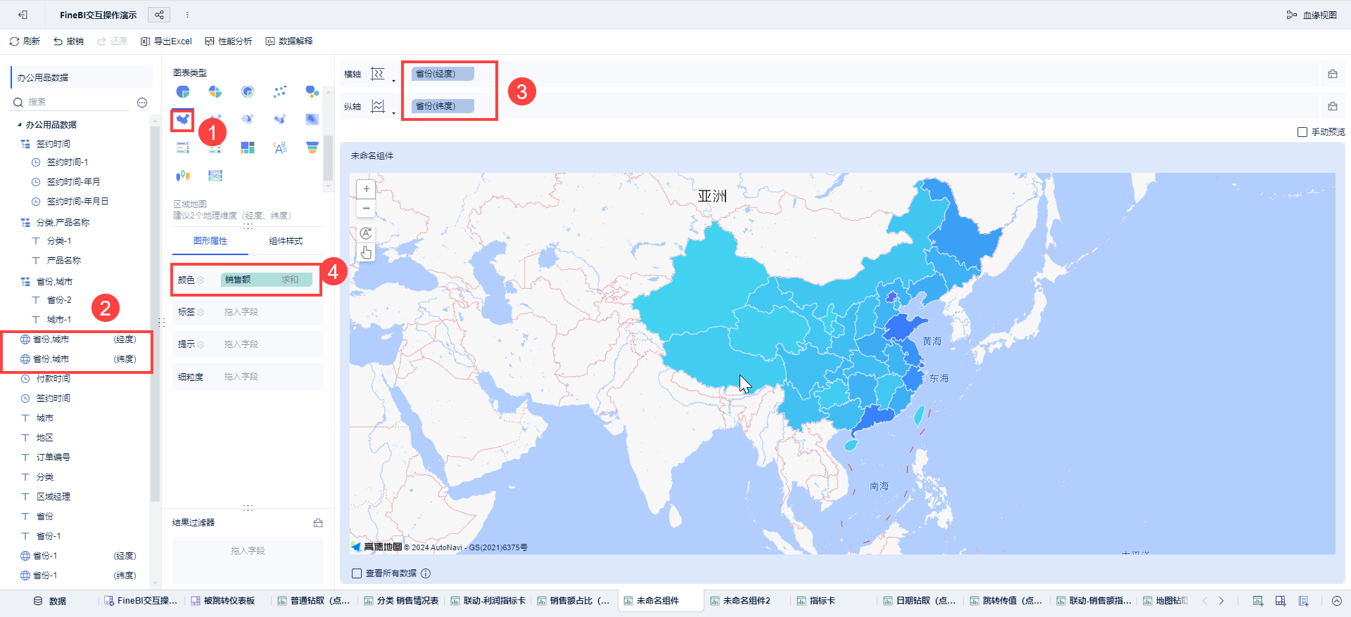 | 不同省份销售额地图 | 区域地图 | 1)选择图表类型「区域地图」; 2)将「省份」字段,下拉设置为「地理角色>省/市/自治区」; 3)将省份的经纬度字段拖入分析区域,将「销售额」拖入颜色栏; 4)在「组件样式」可取消显示的 图例 ,如下图所示: