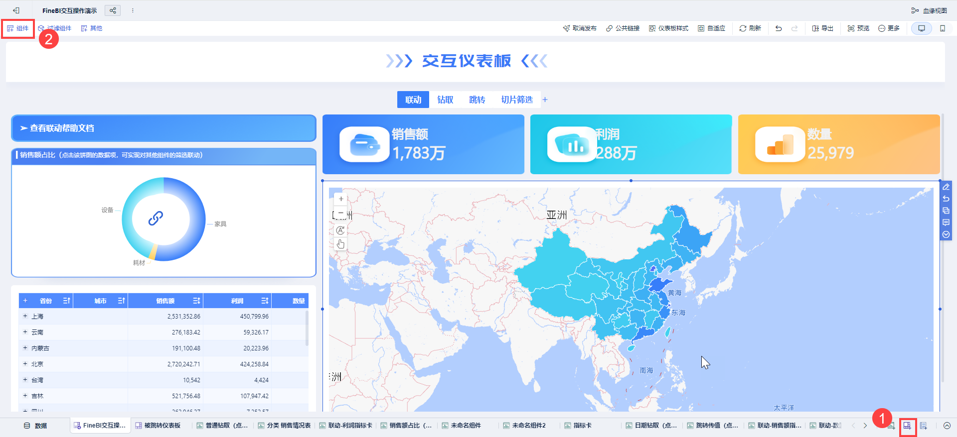 2)使用数据表制作分析产品销售额的多个组件(饼图、指标卡、地图、分组表);