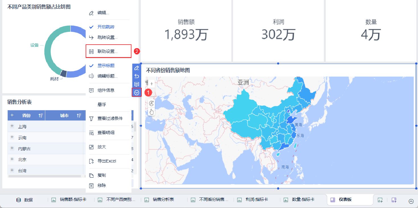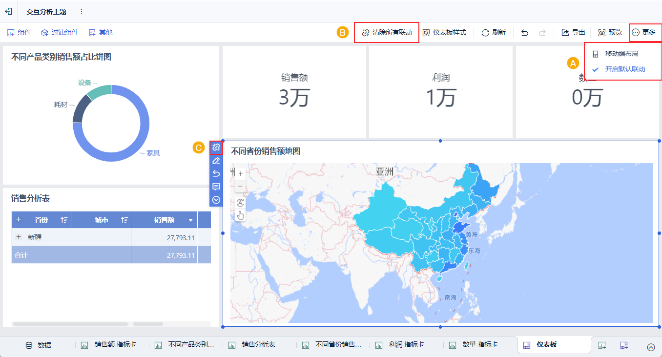 此外,销售额指标卡、利润指标卡、数量指标卡、分组表都重复如上操作步骤,即可清除除「饼图」外的其他的组件联动。