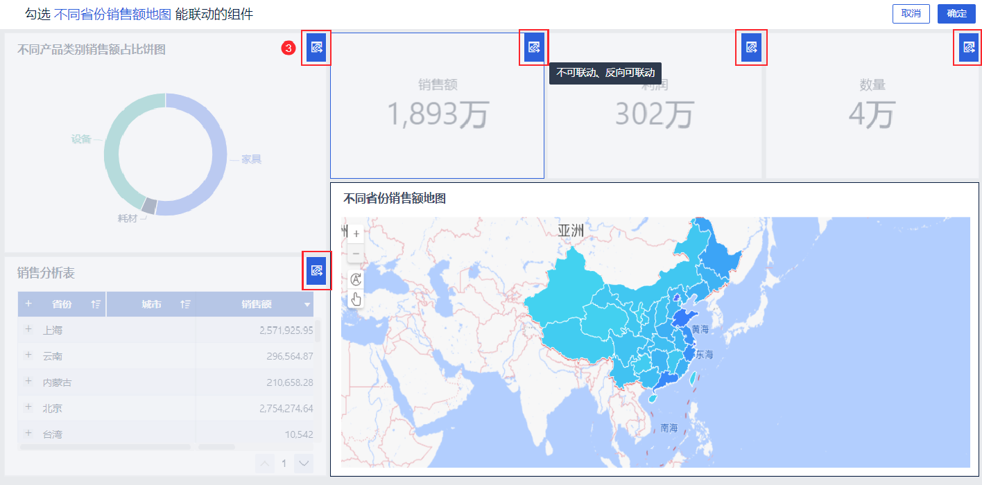 例如我只希望点击「饼图」时会产生联动,那么取消指标卡、地图等其他组件的联动效果即可。
