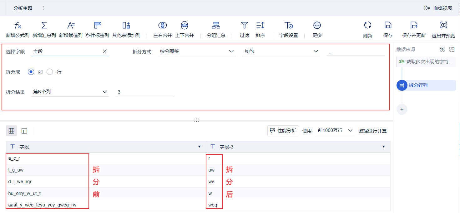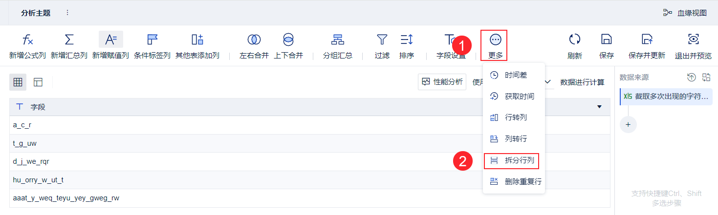在数据编辑界面点击「更多>拆分行列」,进入功能界面,如下图所示: